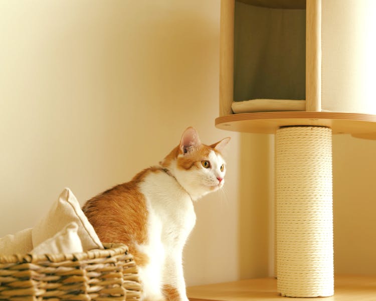 Room consists of a large cat-tree, large litter box, wall mounts, sleeping basket, and basic necessities like water fountain and a food bowl.