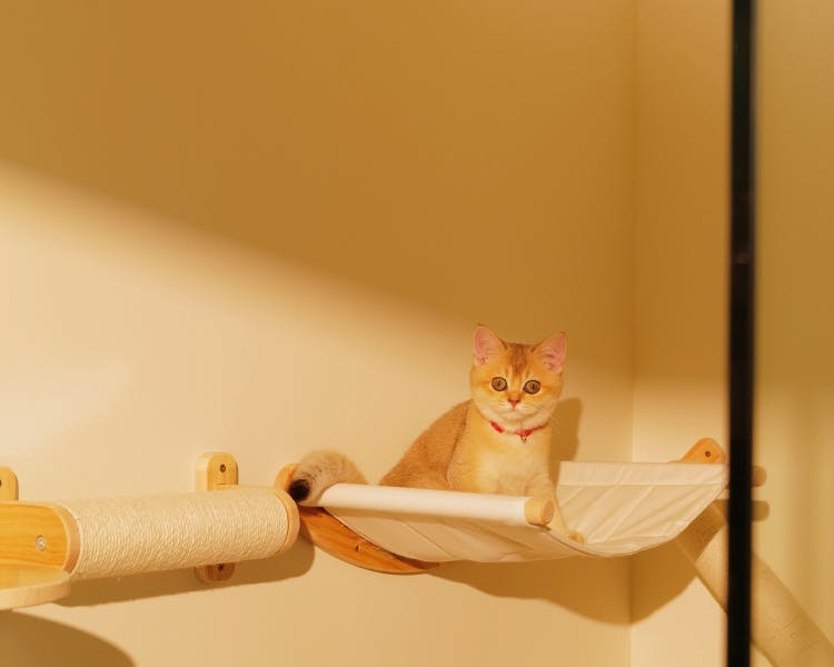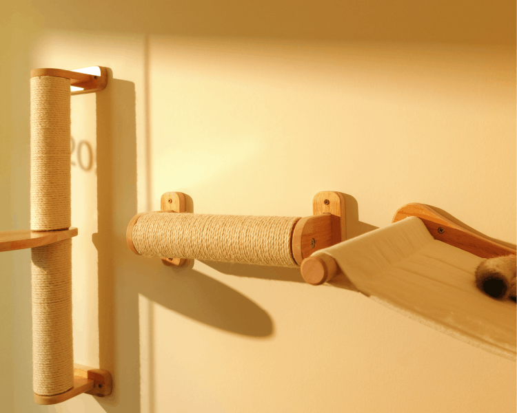 Room consists of a medium sized cat-tree, medium-sized litter box, wall mounts, and basic necessities like water bowl and food bowl.